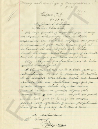 Carta que envía el señor Adolfo Zepeda Jiménez, Inspector de Servicios Especiales de los FF.CC., al general PEC saludándolo, manifestándole su adhesión y diciéndole que tuvo que aceptar ese empleo porque fue despojado de sus derechos de trabajador y fueron desconocidos sus servicios prestados a los Ferrocarriles en trenes militares de 1916 a 1919.