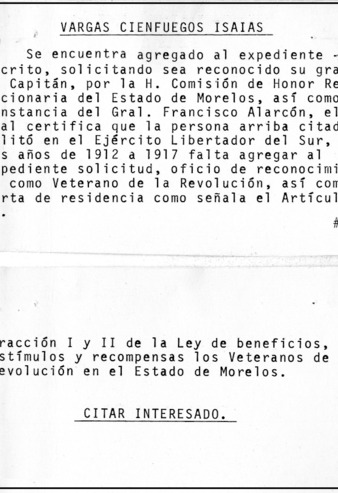 Eliminar la restricciónIncluido en:: Fondo: Instituto Pro Veteranos de la Revolución del Sur/1. Serie: Expedientes de veteranos