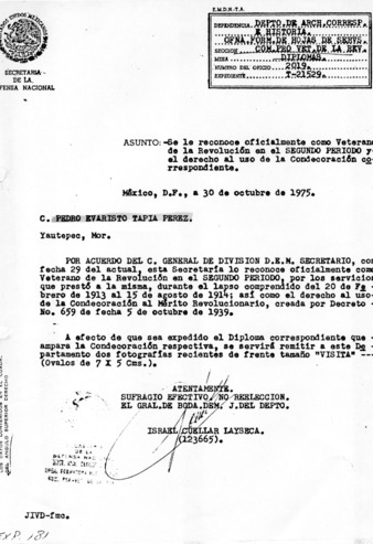 Expediente del veterano Octavio Tapia Martínez