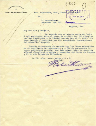 Carta del Gral. Alvaro Obregón al Gral. Roberto Cruz, Jefe de Operaciones Militares en Nayarit, presentando al Mayor Juventino Espinosa. Esquela del fallecimiento de la niña Carmen Aurora Cruz, hija del Gral. Roberto Cruz. Telegrama de condolencia del Gral. Obregón. Exp. C-028