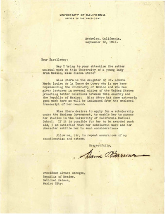 Carta de la oficina del Presidente de la Universidad de California al Presidente Alvaro Obregón, pidiendo una beca del Gobierno de México para que la Srita. Blanca Otero estudie Medicina en dicha Universidad.