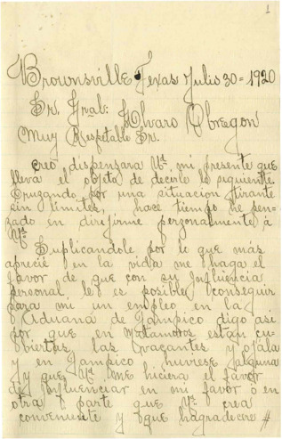 Fondo: Álvaro Obregón/3. Sección: Primera campaña política/3.5 Serie: Correspondencia 1920 (expedientes integrados)