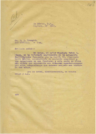 Telegrama del Sr. R.B. Creager al Gral. Alvaro Obregón agradeciéndole una carta.