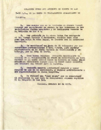 Declaración del Sr. Manuel Camargo, denunciando las arbitrariedades cometidas por el Presidente Municipal de Cananea y la Unión de Trabajadores Asalariados de Cananea, en la que firman como testigos Máximo Urrea, C.M. Martínez y Blas L. Montaquez. Además hay dos relaciones de las sesiones de la Unión de Trabajadores Asalariados.
