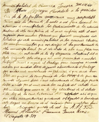Carta del Sr. Manuel A. Peralta al Gral. Alvaro Obregón, informando que él y varios compañeros han sido despedidos de sus empleos por haber participado en la junta instaladora de las casillas en el estado de Sonora.