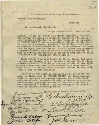 Correspondencia entre los Srs. Gregorio Morales, Celso Ramírez, Alberto Morales y demás miembros de un grupo de mexicanos residentes en el pueblo de Sierra Blanca, Tex., E.U.A. y el Gral. Alvaro Obregón, en la que los primeros solicitan al Gral. Obregón les dé una concesión agrícola en Chihuahua para regresar a México. Exp. M-58