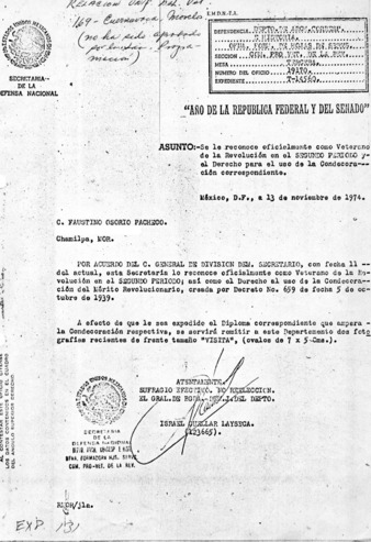 Expediente del veterano Francisco Pérez Ocampo