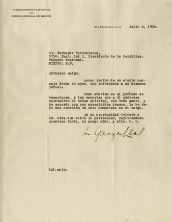 El Sr. L. Garza Leal, Cónsul General de México en San Francisco, Cal., E.U.A., acusa recibo a Fernando Torreblanca de su mensaje referente a su hermano Rafael; informa que es periodo de vacaciones para las escuelas y que ya situó en El Paso, Texas un dinero.