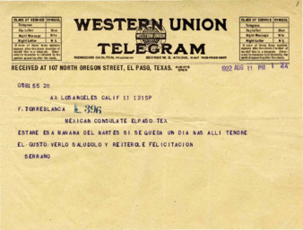 Telegrama del General Francisco Serrano a Fernando Torreblanca, Secretario Particular de la Presidencia de la República con saludos y felicitaciones; el General Alvaro Obregón agradece felicitación de onomástico. El Sr. "Muzquiz" le informa que aún no recibe el número de motor para cotizar precio.