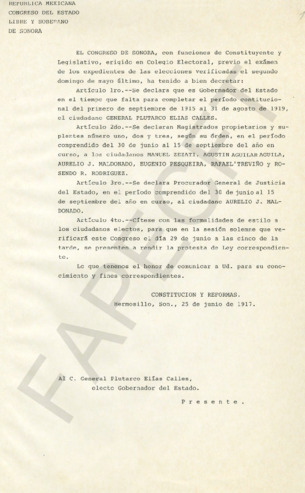 Decreto del Congreso de Sonora en el que se declara Gobernador del Estado para completar el periodo constitucional del 1 de septiembre de 1915 al 31 de agosto de 1919 al Gral. PEC (Ver Museo).