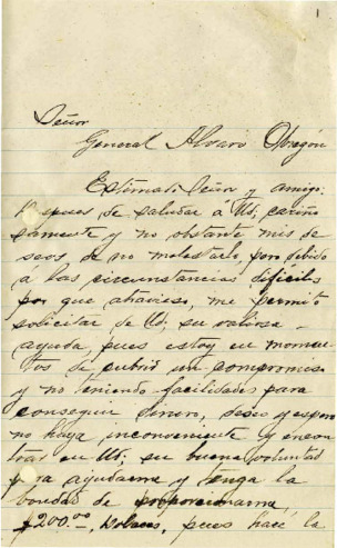 Carta del Sr. Alberto A. Saracho al Gral. Alvaro Obregón solicitándole le preste doscientos dólares. Respuesta lamentando no poder atender su solicitud.