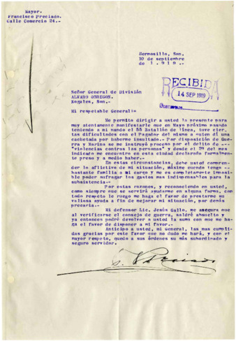 Fondo: Álvaro Obregón/2. Sección: Estancia en Sonora/2.7 Serie: Correspondencia 1919, primera mitad (sub-serie original)
