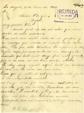 Cartas de Humberto y Refugio Obregón a su padre, el Gral. Alvaro Obregón, informando de sus progresos en la escuela. Telegrama entre el Gral. Alvaro Obregón, el Sr. Manuel Vargas y Humberto y Refugio Obregón, relativos a la llegada a Los Angeles, Cal. de una ahijada del Gral. Obregón.
