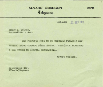 Fondo: Álvaro Obregón/2. Sección: Estancia en Sonora/2.5 Serie: Correspondencia 1918 (sub-serie original)