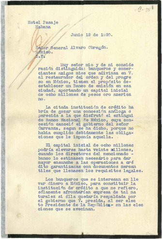 El Gral. Enrique Loinaz del Castillo, a nombre del pueblo cubano, felicita al Gral. Alvaro Obregón por su trinfo electoral.
