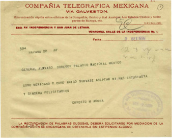 Telegrama del Sr. Ernesto M. Acuña al Gral. Alvaro Obregón felicitándolo por su triunfo electoral.