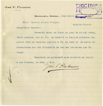 Correspondencia entre el Sr. José V. Palomino y el Gral. Alvaro Obregón, en la que el primero solicita al Gral. Alvaro Obregón le envíe una fotografía reciente a fin de poder hacer un busto en yeso.