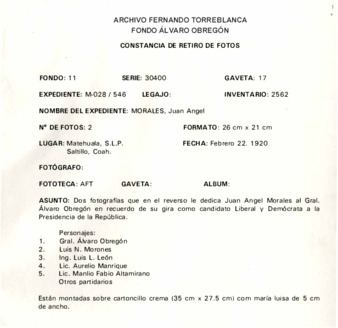 Juan Angel Morales, de Matehuala, S.L.P. envía al Comité Pro-Serrano una copia de una carta en la que le pide a Fernando Torreblanca un discurso pronunciado por el General Alvaro Obregón en esa ciudad durante su primera campaña política, donde le comenta una conversación que tuvo con el General Obregón en la que le pidió que no se corrompiera y que dejara que después de él otros gobernaran. Posteriormente el General Obregón pronunció un discurso denunciando a los Hombres Yedra, que una vez que escalaban el poder ya no lo podían dejar. Respuesta agradeciendo la carta que ilustra el cambio del General Obregón.