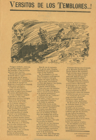 Fragmento de la primera estrofa: "Pongan cuidado, señores, lo que les vengo a contar del temblor y sus horrores que nos hizo vacilar.” | 1 hoja color amarilla impresa en offset: 30 x 20 cm; Fecha de publicación no identificada