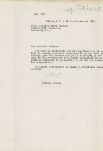 Correspondencia entre Alfonso Reyes, presidente de El Colegio de México, y Aurelio Romero, relativa a la imposibilidad de atender la solicitud de Aurelio Romero por recortes en el presupuesto de El Colegio.