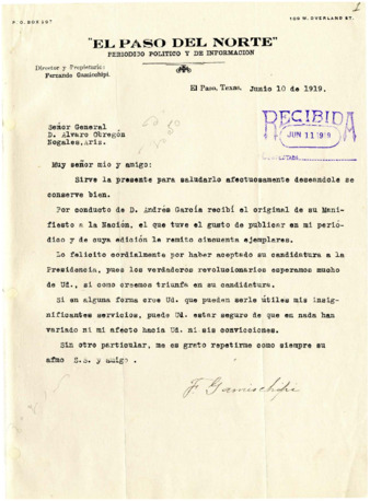 Correspondencia entre el Sr. Fernando Gamiochipi, Director del periódico EL PASO DEL NORTE de El Paso, Tex., E.U.A. y el Gral. Alvaro Obregón, en la cual el primero comunica al Gral. Obregón haber publicado su MANIFIESTO A LA NACION y le remite cincuenta ejemplares; asimismo, lo felicita por su candidatura.