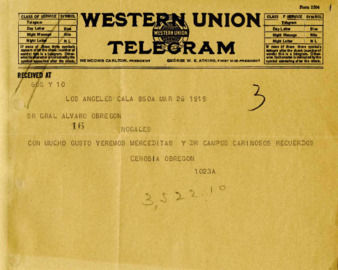 Correspondencia entre la Srita. Rosa Obregón y su hermano, el Gral. Alvaro Obregón, relativa a asuntos familiares y al viaje de los hijos del Gral. Obregón. El Gral. Alvaro Obregón felicita a su hermana por su cumpleaños.