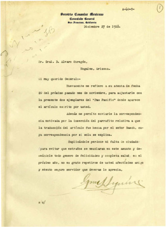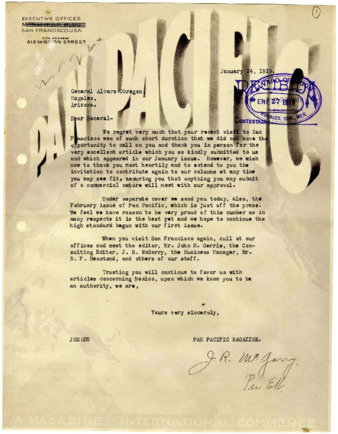 Carta del Sr. Mc Garry, editor del PAN PACIFIC MAGAZINE de San Francisco, Cal., E.U.A. al Gral. Alvaro Obregón, agradeciéndole el artículo que envió como colaboración. Se anexa un volante impreso anunciando el periódico con datos sobre sus colaboradores, circulación y precios de suscripción. Respuesta de agradecimiento.