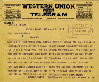 Telegrama del Sr. Norman Walker, corresponsal de la PRENSA ASOCIADA en El Paso, Tex., E.U.A. al Gral. Alvaro Obregón, preguntando sobre su posible candidatura a la Presidencia y su programa. Respuesta considerando prematuro el asunto.
