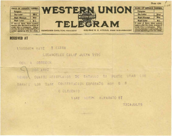 Telegrama del Sr. E. Clemento al Gral. Alvaro Obregón, ofreciendo en venta aeroplanos. Exp. C-018