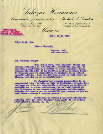 Carta de los Srs. José y Víctor D. Salazar, comerciantes y comisionistas, al Gral. Alvaro Obregón, ofreciéndole sus servicios para colaborar en su campaña política.