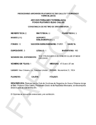 Diploma que el Club de Hombres de Negocios de Nueva Orleans otorga al Gral. PEC, Presidente electo de la República Mexicana, con los mejores deseos para su administración (Ver Museo).