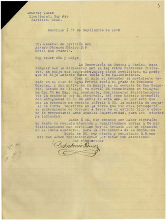 Fondo: Álvaro Obregón/3. Sección: Primera campaña política/3.1 Serie: Correspondencia 1919, segunda mitad (sub-serie original)