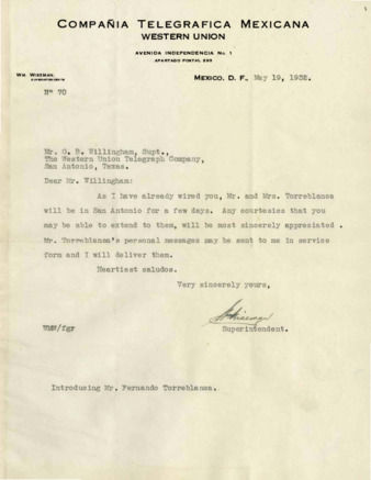 W.M. Wiseman, Superintendente de la Compañía Telegráfica Mexicana Western Union, recomienda ante G.B. Willingham, Superintendente de The Western Union Telegraph Company de San Antonio, Texas, a Fernando Torreblanca, quien visitará San Antonio por unos días. El asistente del Gerente de The Chase Bank introduce ante el Gerente de The American Express Company Inc. a Fernando Torreblanca.