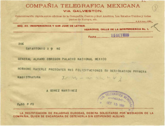 Telegrama del Sr. A. Gómez Martínez al Gral. Alvaro Obregón felicitándolo por su triunfo electoral.