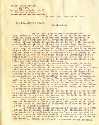 Fondo: Álvaro Obregón/3. Sección: Primera campaña política/3.5 Serie: Correspondencia 1920 (expedientes integrados)