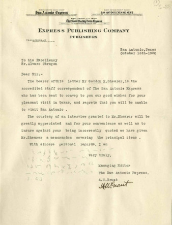 Carta del Sr. A.W. Grant, Gerente Editorial de THE SAN ANTONIO EXPRESS, pidiendo le conceda una entrevista al Sr. Gordon K. Shearer para dicho periódico. Exp. S-25
