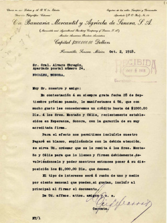 Documentación relativa al préstamo que concedió la Compañía Bancaria Mercantil y Agrícola de Sonora, S.A. a los Srs. Montaño Celis y del cual es aval el Gral. Alvaro Obregón.