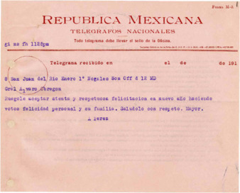 Telegrama del Mayor A. Pérez al Gral. Alvaro Obregón felicitándolo por Año Nuevo.