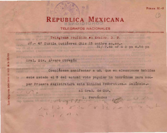 Telegrama del Gral. de División, L. Fernández al Gral. Alvaro Obregón, informándole que ha resultado electo para el cargo de Gobernador de Chiapas. Respuesta de enterado y felicitándolo por su triunfo.