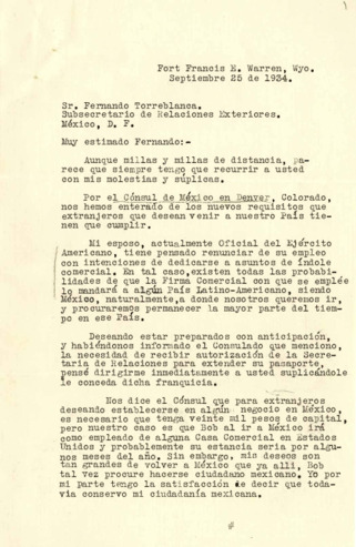 Julieta Maldonado de Andrews solicita ayuda a Fernando Torreblanca, Subsecretario de Relaciones Exteriores para obtener los permisos y documentos necesarios para ir a México en donde su esposo Roberto C. Andrews trabajará como empleado de alguna casa comercial de Estados Unidos.