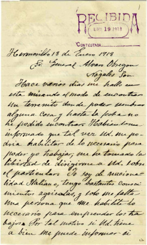Carta del italiano Antonio Ferraro al Gral. Alvaro Obregón solicitándole ayuda para dedicarse al cultivo de la tierra.