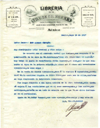 Correspondencia entre el Gral. Alvaro Obregón y la Librería de la Vda. de Ch. Bouret relativa a la publicación y venta de la obra OCHO MIL KILOMETROS EN CAMPAÑA.