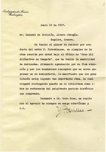 Carta del Gral. Alvaro Obregón al Sr. Alejandro Carrillo pidiéndole que le ayude a vender 300 ejemplares de la obra OCHO MIL KILOMETROS EN CAMPAÑA.