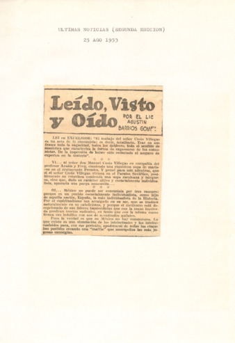 Nota de prensa publicada en la columna Últimas Noticias del periódico Excélsior titulada Leído, Visto y Oído, en la que realiza un análisis crítico de las palabras de Daniel Cosío Villegas en su artículo El Comunismo en América Latina.