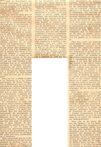 Recorte del periódico Excélsior titulado La Iglesia Católica en América Latina, de la autoría de Jaime Aynés Baschet, en respuesta al artículo de Daniel Cosío Villegas titulado El comunismo en América Latina.