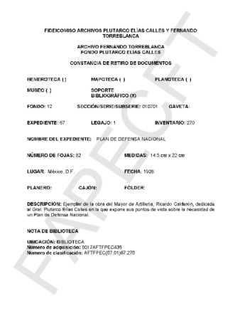 Obra del Mayor de Artillería Ricardo Calderón, dedicada al Gral. PEC, en que expone sus puntos de vista sobre la necesidad de un Plan de Defensa Nacional (Ver Biblioteca).