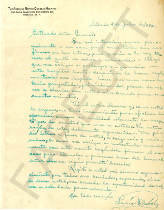 Carta que envía el doctor Ignacio Chávez al general PEC saludándolo y manifestándole su agrado por su regreso a México.