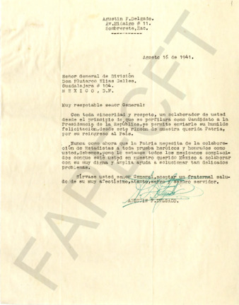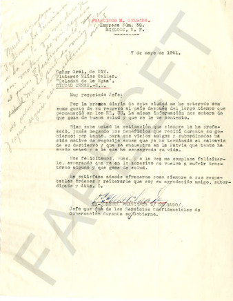 Carta que envía el ex coronel Francisco M. Delgado al general PEC saludándolo y felicitándolo con motivo de su regreso a México.