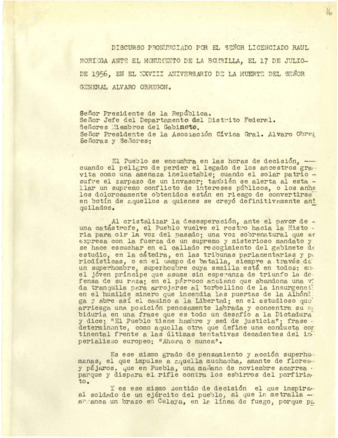 Discurso pronunciado en la ceremonia conmemorativa del vigésimo octavo aniversario de la muerte del Gral. Alvaro Obregón por el Lic. Raúl Noriega, Oficial Mayor de la Secretaría de Hacienda y Crédito Público. Versión mecanografiada y su publicación en la prensa (esta última pasó al planero 1, cajón 1, carpeta 5, folder 4). "Discurso del Lic. Noriega en la ceremonia de homenaje del 17 de julio al Manco de Celaya", PATRIA NUEVA, México, D.F. Agosto, 1956, pp. 1 y 2. Folleto impreso con el mismo discurso.
