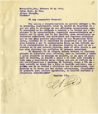Carta del Cap. Carlos Peña al Gral. Alvaro Obregón pidiéndole ayuda económica; anexa certificado de servicios militares. Respuesta lamentando no poder ayudarlo.